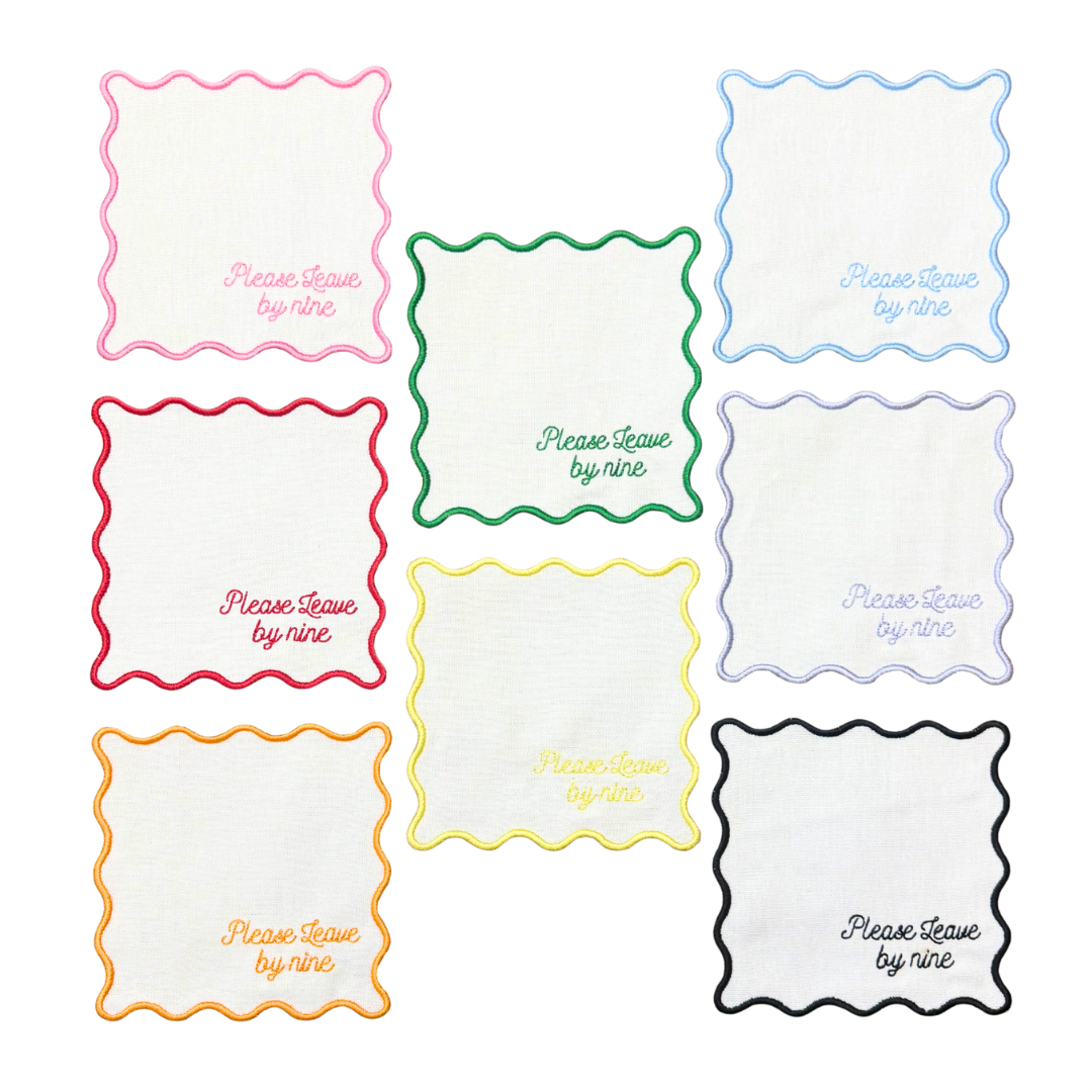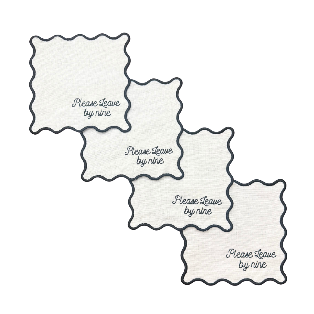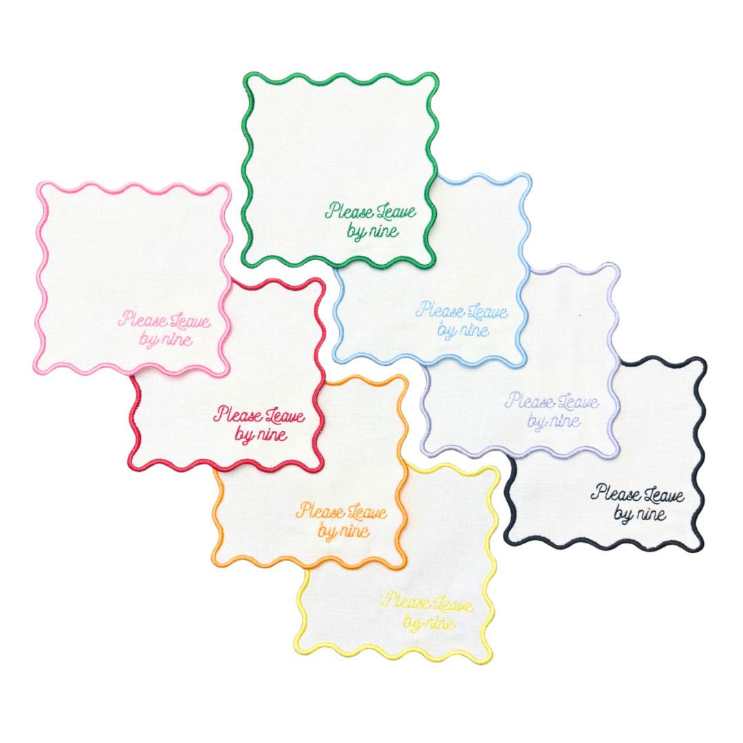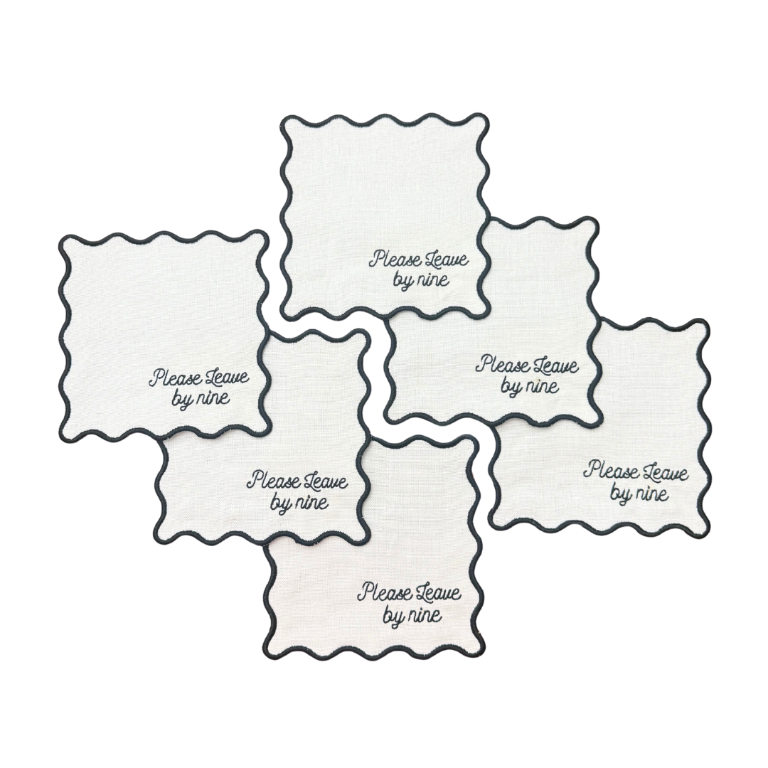 Scalloped “Please Leave By Nine” Linen Cocktail Napkins! They are linen napkins with a scalloped border. You can also get them personalized with initials or a name for a great gift!